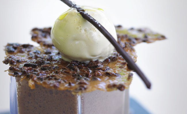Chocolate mousse with cocoa-bean brittle and caramel ice cream