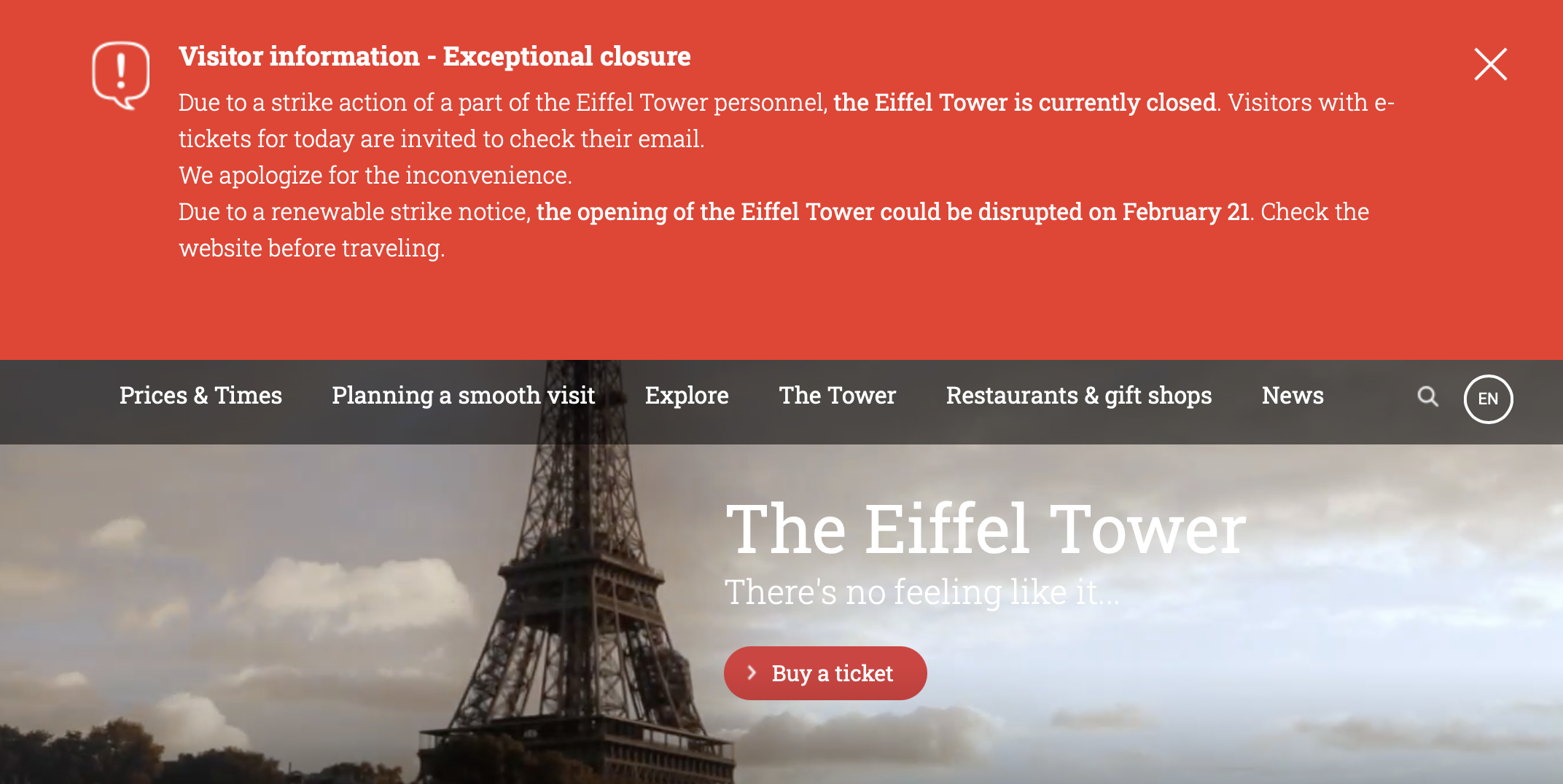 Another week, another strike! No sooner have the recent teachers’ strikes and farmers’ strikes died down than a new wave of strikes have sprung up, affecting travellers in France. Employees at France’s most iconic monument, the Eiffel Tower, went on strike yesterday, citing “financial mismanagement of the monument”. The attraction remains closed today, and a notice on the Eiffel Tower website states that: “Due to a renewable strike notice, the opening of the Eiffel Tower could be disrupted on February 21”. Visitors are encouraged to check the website prior to visiting, and e-ticket holders should check their email for updates and the opportunity to reorganise their visit.