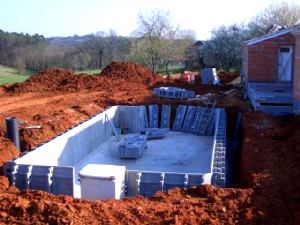 The pool installers started to prepare and shape the pool cavity. Three days later the ready mixed concrete arrived for the pool floor, was laid and shaped followed by the pre cast concrete side sections pumps and filtration units. We had opted for the slightly more expensive salt water system instead of chlorine. Reasons? Less damaging to eyes and skin, gives you softer pool water in an area where the water is notoriously hard and alleviates the algae problem. Our plans also incorporated a ‘ Nager contre le courrant’ system to create a strong current to swim against for exercise. Well worth considering at a modest extra cost. Frequent contact with EDF did not rouse them from their continued sloth!
