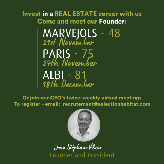 You will have the opportunity to meet Jean-Stéphane Vilain, CEO of Selection Habitat, who will share his vision for the future of the French property market and how our agents can play a key role in it. All events are informal, friendly occasions designed to give you insight into how Selection Habitat supports its agents, and how you can take your next professional step in the world of French real estate.