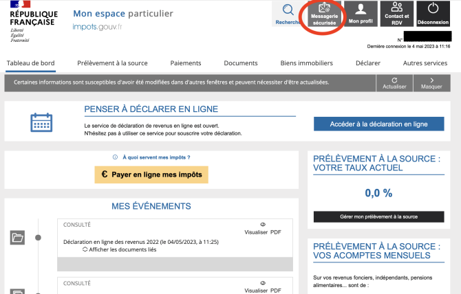 You can also send a message to the tax office from your personal space and this is typically the best way to get in touch with any particular queries or concerns as it will already be linked to your tax account and fiscal number. Simply click the ‘messagerie sécurisée’ in the top right hand corner and follow the instructions.