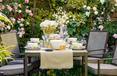 A site as near as possible, attached or even part of the house will make the little trips back and forth for provisions, books etc much easier. Decide how the ‘walls’ of this room are going to be constructed. If bricks and mortar are involved, try to use local materials to blend in with the house. Otherwise consider bamboo, natural garden hedging or selected evergreens to screen off the area and create a secluded space. For gorgeous summery scents and beautiful surrounding colour, add fragrant roses, lavender and thyme or shaped box plants and a weathered statue or urn for a more formal setting. Above all try to create a space where you want to spend a lot of time rather than just for meals!