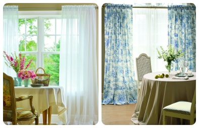 Country style is always very popular for it’s relaxed, fresh and simple look. Kitchen windows can be dressed café style in either plain, printed or check cottons. Delicately patterned lace panels perhaps depicting trees, flowers or butterflies also work very well. Consider hanging them full length or brise-bise – covering only part of the window, usually the lower half. For a very chic idea, look out for curtains that hang from the top of the window and are shaped to a point, with or without added tassels or pompoms! For other windows in the house allow plenty of material so that the curtains are left billowing casually on the floor. Sheer voile curtains can look very pretty and also help to diffuse the sunlight but shutters may be required for evening privacy. Of course how can you have French country decor without a touch of toile and curtains? Especially with a pastoral theme, it can be a great reminder of the outside even on darker days.