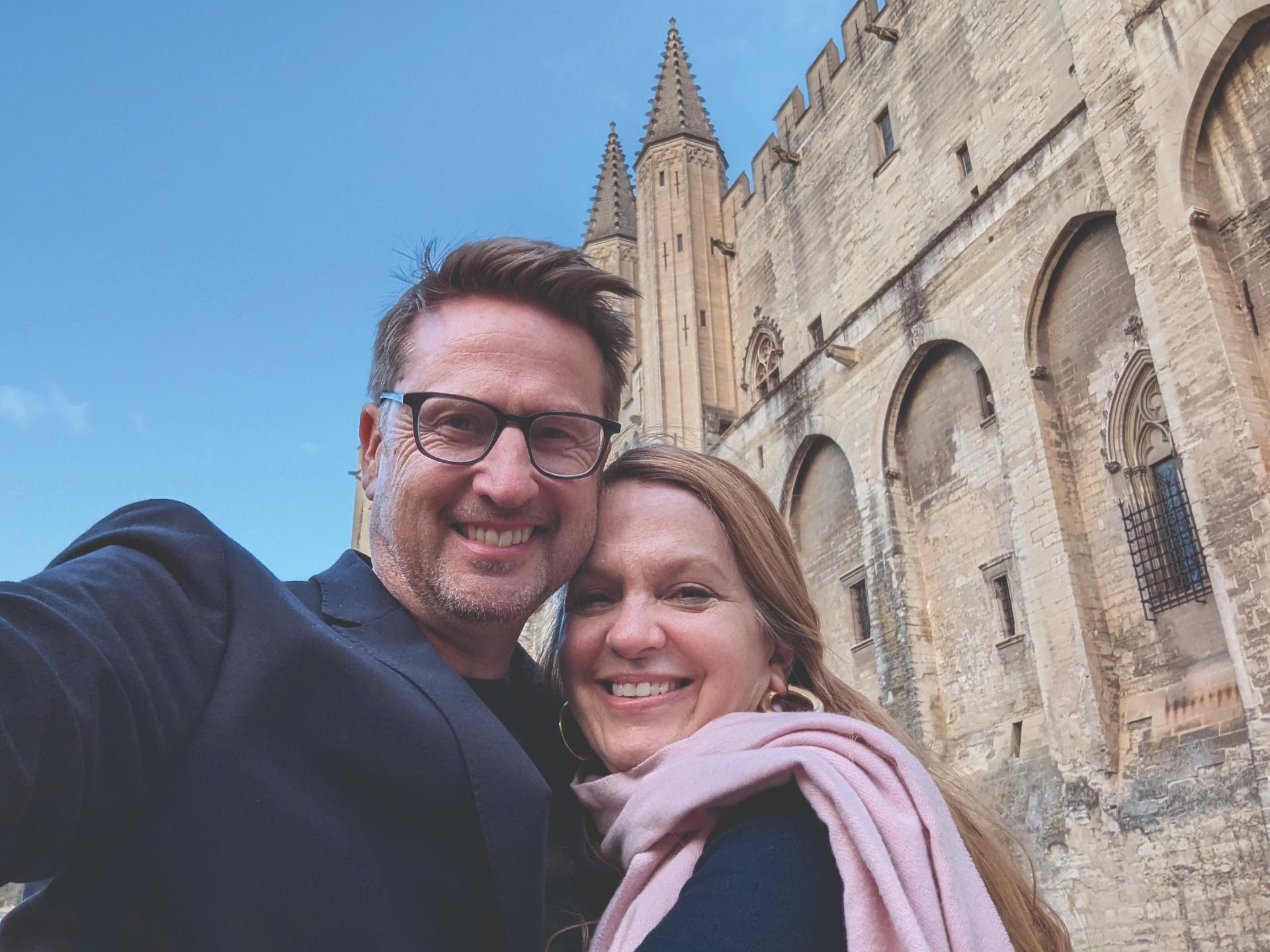 However, the dream wouldn’t die. For years we had subscriptions to all the relevant websites: Belles Demeures, Sotheby’s and so on. We often sent each other advertisements for châteaux in the south of France, enjoying a bit of property porn in our lunch breaks. What do you think of this one? Or this? Or that? But somehow, the right house, in the right place – and, Tobias and Ellen in front of the Palais des Papes, Avignon crucially at the right price never came together. We slowly put together a ‘golden list’ of the perfect château for us: not too big, not too small, in the village, but surrounded by a park. It would be okay if it needed some renovation, but some DIY must be possible (we did have a budget, after all).