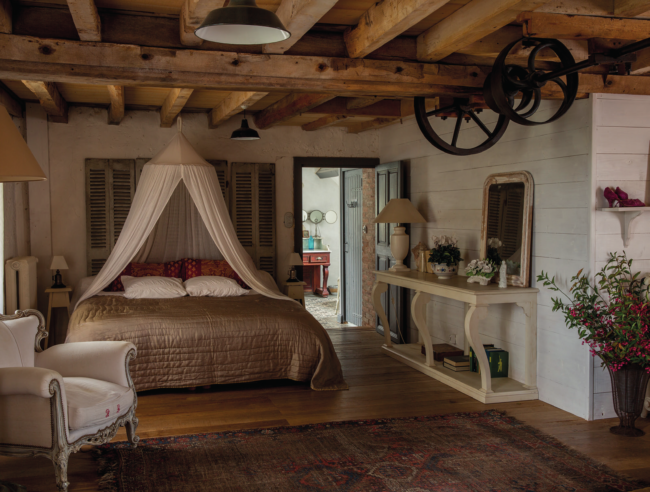 Within the building proper, the simple elegance of the restored space now serving as the dining room puts the original mill workings centre stage, the giant iron pitwheel, stone nut and ‘wallower’ wheel rising impressively from behind a protective dwarfwall of golden limestone. Atop the restored oak staircase the theme continues, although the balance here is between original machinery and furnishings of a little more opulence. Jonathan’s aesthetic may be rustic and authentic, but there’s certainly nothing Spartan about it.